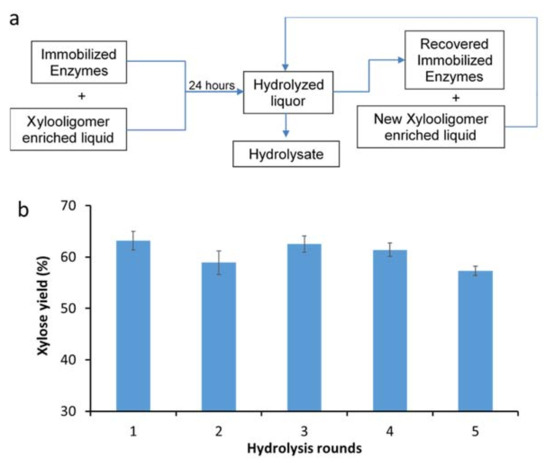 (a) Immobilized xylanase recycling protocol; (b) xylose yield from xylooligomer-enriched pre-treatment liquors over five rounds of recycling immobilized xylanases.