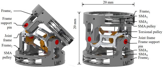 The joint design is symmetric with 2 DOFs using 2 SMA wires in an antagonistic configuration with a torsional spring for each DOF; thus, comprised of 4 wires and 2 springs in total as it is shown in Figure 1. The torsional spring decouples the SMA wires from external forces, thereby providing a flexible and passive compliant behaviour, with reduced energy consumption, diminished heat generation and a safe stable mechanism [32]. Additionally, the spring reduces the impact of any external torque on the system increasing the SMA life [29]. With the SMA wire in antagonistic configuration, the operative range of each joint is related to the length of the wire, which can be = 5–7% of its total length [33]. To reduce the length of the joint, the SMA wire is coiled inside the frame using pulleys (accommodating the wire around the shape of the frame) in order to decrease the friction, hence increase overall efficiency.