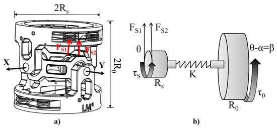 where and are the forces produced by each SMA wire, is the output torque, is the resultant torque produced by the SMA wires antagonist configuration, K the torsional spring elastic constant (considering the Hooke’s law for a linear spring), and are the radius (6 mm) and the angle of the torsional pulley, is half of the joint length (10 mm), the angle of the torsional spring, the maximal compliance angle. Equation (2) defines K of the torsional spring to achieve the maximal compliance angle .