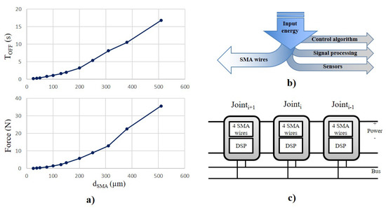 (a) SMA wire Flexinol produced by Dynalloy Inc. performance in terms of SMA wire diameter vs. Force (top graph) and SMA wire diameter vs. (bottom graph). To achieve a mechanical bandwidth above 1 Hz, the SMA wire diameter should not exceed m. (b) In the worst scenario, up to 95% of the power supplies the SMA wires. Control algorithm, signal processing and sensors use only a minimal amount of the overall energy available to the system. However, this increases when the SMA wires are not activated and the mechanical system is moving passively by the compliance behaviour provided by the torsional springs. The advantage of this passive mechanical solution is that when the SMA wires are not active, the energy consumption sink from the actuation system is zero. (c) Proposed distributed control hardware using a parallel bus (e.g., I2C) and power, to achieve a modular system and to simplify the cabling of the robot. Each module is able to control one joint by using a closed-loop position control. This hardware is connected to an external PC and data exchanged by means of an I2C communication bus.