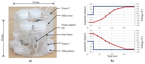 Figure 4a shows final prototype constructed by 3D printing and tested using three different SMA wires to assess the mechanical performance of the actuator. Only 1 DOF was activated and tested since the design has a symmetry and the mechanical principle is the same. The prototype compliant actuator consists of three parts: upper frame (Frame 1) and lower frame (Frame 2) both with a diameter of 20 mm, and a length of 11 mm, and a linker (15.2 mm diameter), which connects both frames by four 1.5 mm pins and two torsional springs, as shown in Figure 4a. All the experiments were performed at room temperature and by using low temperature (LT) standard Flexinol actuator SMA wires produced by Dynalloy Inc. (Irvine, CA, USA). The power provided for each 40 mm wire is shown in Table 4. The mean response time of the system is below 260 ms, which is also the time taken to achieve an angle of . During these preliminary experiments, no heating problems were encountered.