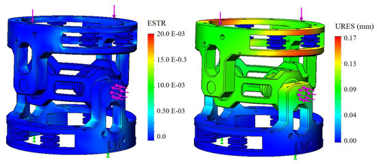 The analysis was performed using SolidWorks simulation software (2016). External forces were applied to 2 sections of the frame. One section is the SMA wires with connection to the main pulley because of the stress produced by the wires when activated. The other is top section of the frame to which one or more MCJs will be connected. In the analysis, the bottom section of the MCJ is defined as fixed. Figure 5 shows the FEA of the MCJ applying 2 forces of 10 N each, superior to and lateral to the frame (violet force in the figure) and the fixed section (green force). The simulation reports the ESTR and URES values, ESTR representing the equivalent strain and the URES, the U value of the resultant of the displacement in millimetres.