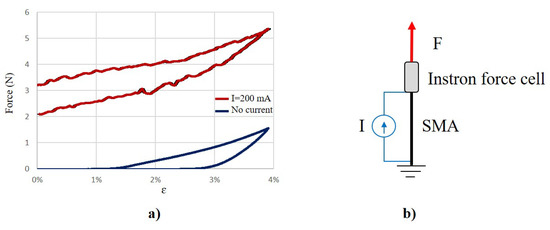 Figure 6a shows the characteristic hysteresis profile of SMA wires. The blue line shows wire when not activated (in the martensite). The external force produced by the Instron stretches the wire with a limited recovery of the original shape on unloading. The activated wire shown by the red line is associated with an increase in the temperature and transition from martensite to austenite. The increase of the external force stretches the SMA wire. When the Instron force is reduced, the phase wire changes from the austenite to the martensite phase. This transition is responsible for the hysteresis in the force vs. strain profile.