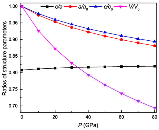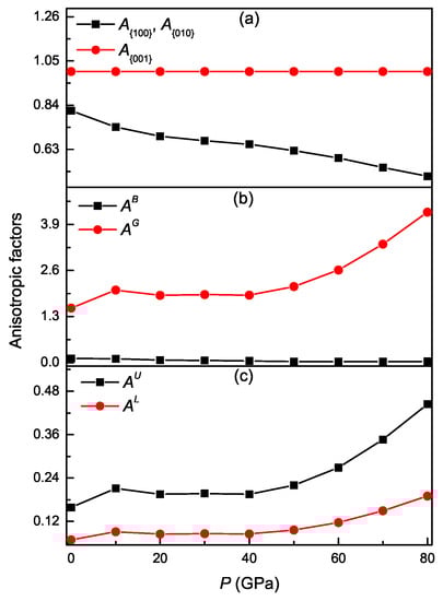 where also signifies the anisotropy of linear compressibility along the a or c axis. For an isotropic material, the value of must be unity. A deviation less than or greater than unity represents the degree of anisotropy. As shown in Figure 7b, TiAl presents elastic anisotropy due to its being a value smaller than unity. The values of increase approximately with pressure, but the variation is very small.