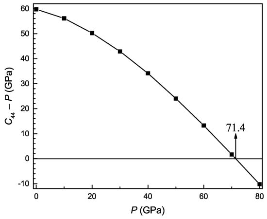 The three conditions are related to different deformations of the crystals under isotropic pressure. A value approaching zero indicates the shear deformation of the cell under isotropic pressure for , the expansion of the direction along the spindle axis under isotropic pressure during the contraction of the other symmetry direction perpendicular to the spindle axis under isotropic pressure for , and the deformation of the volume under isotropic pressure for . Figure 3 shows the pressure dependence of for the TiAl intermetallic compound. When the value of is no longer larger than zero, it indicates that the hexagonal structure of the compound is mechanically unstable above pressures of about 71.4 GPa.