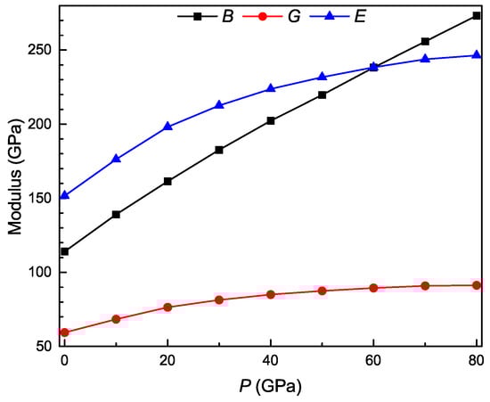 Bulk (B), shear (G), and Young’s (E) moduli as a function of pressure for TiAl.