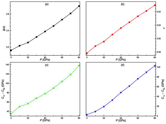 B/G ratio (a), Poisson’s ratio (b), and Cauchy pressures (c), (d) as a function of pressure for TiAl.