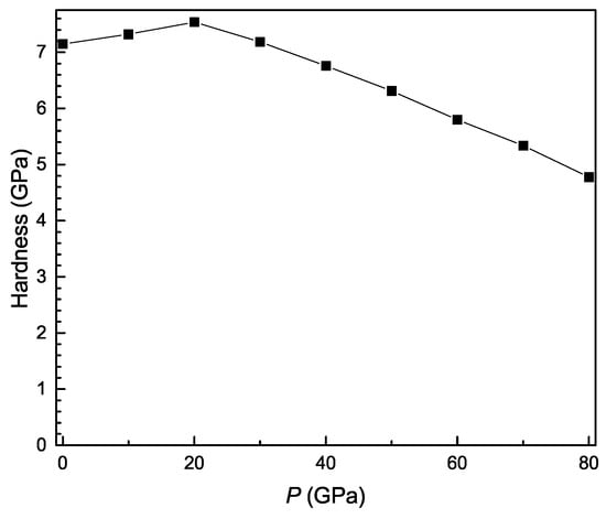 The pressure dependence of theoretical hardness is shown in Figure 6. It is clearly observed that the hardness decreases approximately with pressure.