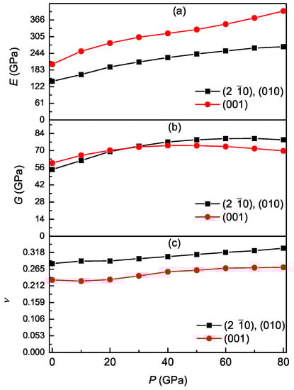 The average Young’s modulus on the (20) and (010) prismatic planes and the (001) basal plane (, , and ) are given by [30,39]