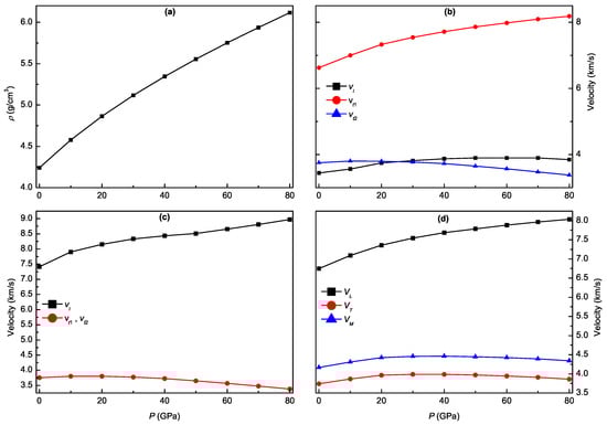 Mass density (a), longitudinal and transverse sound velocities , , and in the [100] (b) and [001] (c) principle directions, and polycrystalline longitudinal, transverse, and average sound velocities , , and (d) as a function of pressure for TiAl.
