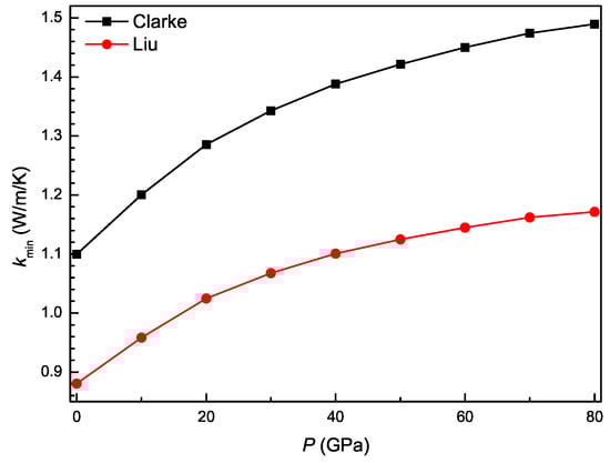 Figure 11 shows the pressure dependence of minimum thermal conductivity for TiAl. It is clearly observed that the value of obtained from the two models increases monotonously with pressure. At the same pressure, the value calculated by the modified Clarke’s model is significantly smaller than that calculated by Clarke’s model. This shows that the minimum thermal conductivity of TiAl is markedly reduced after considering its elastic anisotropy.