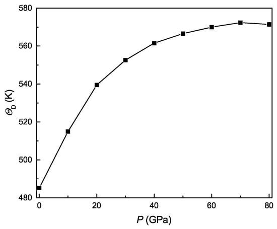 where the parameters h, , n, , and M are, in turn, the Plank constant, the Boltzmann constant, number of atoms in the molecule formula, Avogadro’s number, and molecular weight. Figure 12 show the pressure dependence of Debye temperature for TiAl. It is clearly found that the value of increases monotonously with pressure and exhibits a change trend similar to the minimum thermal conductivity, following the Callaway–Debye theory [50]. Experimentally, the Debye temperature of TiAl was determined as 495 K from specific heat measurements [51] and 478 K from the single-crystal X-ray diffraction pattern [52], which agree well with our calculated value of 485.16 K at zero pressure.