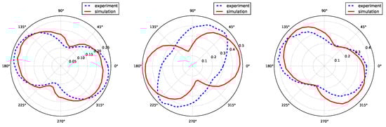 Finally, a quantitative comparison between experimental FWEM and simulated FWEM is presented in Figure 11. Simulated curves are plotted for an applied strain of , and experimental surfaces are plotted for the last step of the topotomography experiment. Both curves were in very good agreement for Grain 4 and Grain 18, for both shape and orientation. For Grain 10, the surface had the right amplitude, but not the right direction. As explained previously, the direction of the dumbbell-shaped curve was linked to the precise combination of active slip systems within the grain, and the discrepancy between the predicted and observed slip systems was presumably the cause of the mismatch in orientation for this case.