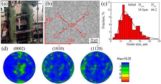 The equipment of the rolling mill (a), and microstructure characteristics regarding metallography observation (b), corresponding grain size distribution (c), and (0002), (10-10), (11-20) pole figures of initial material (d) (RD: rolling direction, TD: transverse direction).
