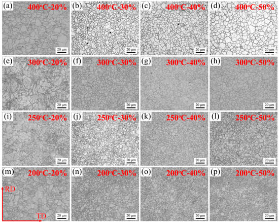 Metallographic observations of AZ31 magnesium alloy sheets under different rolling process parameters: (a) 400 °C—20%, (b) 400 °C—30%, (c) 400 °C—40%, (d) 400 °C—50%, (e) 300 °C—20%, (f) 300 °C—30%, (g) 300 °C—40%, (h) 300 °C—50%, (i) 250 °C—20%, (j) 250 °C—30%, (k) 250 °C—40%, (l) 250 °C—50%, (m) 200 °C—20%, (n) 200 °C—30%, (o) 200 °C—40% and (p) 200 °C—50%.