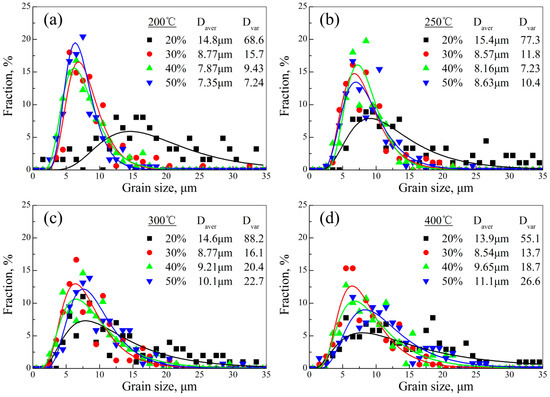 Figure 2 shows the metallographic observations of AZ31 magnesium alloy sheets under different rolling process parameters. Their grain size distributions are summarized in Figure 3. Clearly, all the sheets after hot rolling possessed abundant twins when the thickness reduction was 20%. As the thickness reduction increased to 30%, these twins nearly disappeared and, meanwhile, a large number of fine equiaxed grains appeared, indicating that DRX behavior occurred at this stage. Apart from the 20% sheets, other grain size distributions in Figure 3 were well-fitted by the log-normal distribution function, which suggested the microstructure homogeneity. This was also a typical sign that DRX improved the microstructure homogeneity [26]. In addition, it was noteworthy that there existed remarkable differences in microstructure characteristics between 20% sheets and other sheets, i.e., the twin microstructure in 20% sheets and DRX microstructure in other sheets (30%, 40%, and 50%). This was mainly ascribed to the difference in deformation behavior during hot rolling. More specially, the above results demonstrated that the deformation was primarily accomplished via twins in 20% sheets, while this occurred via DRX in the other sheets (30%, 40%, and 50%). According to the literature [19,23], the critical deformation for twins was lower than that for DRX. If the amount of deformation was not attained in the critical deformation for DRX but for twins, then twin would be activated, which resulted in the release of stored energy and, then, the suppression of DRX. Figure 2 also shows that there existed a small quantity of DRXed grains in 20% sheets. Therefore, in the present work, the deformation was accommodated by twins in the majority, with a minor supplement of DRX at the amount of 20% deformation while, above 30%, the occurrence of DRX was the main mechanism for accommodating the deformation.