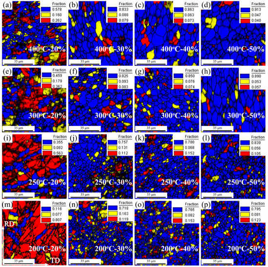 Microstructure characteristic maps of DRXed grains, subgrains, and deformed grains of AZ31 magnesium alloy sheets under different rolling process parameters: (a) 400 °C—20%, (b) 400 °C—30%, (c) 400 °C—40%, (d) 400 °C—50%, (e) 300 °C—20%, (f) 300 °C—30%, (g) 300 °C—40%, (h) 300 °C—50%, (i) 250 °C—20%, (j) 250 °C—30%, (k) 250 °C—40%, (l) 250 °C—50%, (m) 200 °C—20%, (n) 200 °C—30%, (o) 200 °C—40% and (p) 200 °C—50% (recrystallized grain—blue region; subgrain—yellow region; deformed grain—red region).