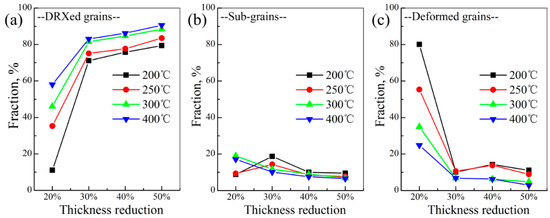 In terms of the effect of rolling temperature on DRX behavior, it played a similar role to the thickness reduction. Generally, lower deformation temperature led to increased critical deformation for DRX. This meant that DRX only occurred in some regions where the deformation was high enough, while not in other regions if the deformation was below the critical deformation, especially in the core of coarse grains. In view of this, it could be seen in the 200 °C—30% sheet (Figure 2n) that the DRXed fine grains only existed at the old grain boundaries, and many coarse grains still remained. This could be explained according to the fragmentation of coarse grain. Under the strain field of rolling process, the dislocations in coarse grain were rearranged into low angle grain boundaries (LAGBs). These LAGBs then progressively rotate, such that the misorientation increases continuously and, subsequently, HAGBs form. However, if the deformation was not enough, the fragmentation of coarse grain did not occur completely, which finally led to some remaining coarse grains [27]. Further observations on the 200 °C sheets could reveal that the fractions of these coarse grains decreased with the increase of thickness reduction. This could be ascribed to two factors: first, high thickness reduction played favor to increase the nucleation sits for DRX, so that the coarse grains were consumed more; second, high thickness reduction made more mechanical energy convert into heat energy of the sheets, which increased the deformation temperature and, subsequently, facilitated the occurrence of DRX.