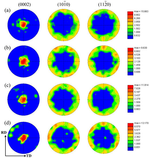 (0002), (10-10), and (11-20) pole figures of AZ31 magnesium alloy sheets for (a) 400 °C—20%, (b) 400 °C—30%, (c) 400 °C—40%, and (d) 400 °C—50% (RD: rolling direction, TD: transverse direction).