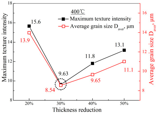 Maximum texture intensity variation and corresponding average grain size variation with the increase of thickness reduction at a given rolling temperature of 400 °C.