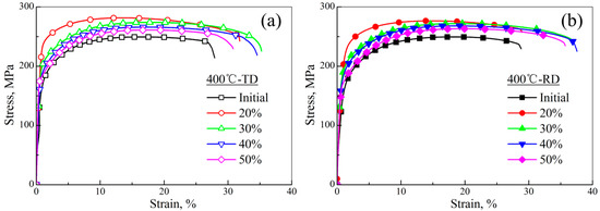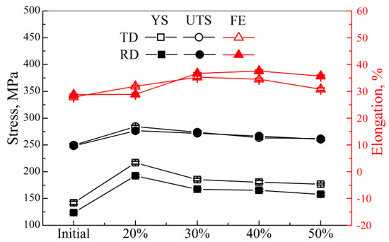 Figure 10 shows the stress–strain curves of AZ31 magnesium alloy sheets at a given rolling temperature of 400 °C. Their yield stress (YS, MPa), ultimate tension stress (UTS, MPa), and fracture elongation (FE, %) are summarized in Table 2, and their corresponding variations are shown in Figure 11. Clearly, the YS along both directions in resulting sheets increased obviously, compared to the initial material, which could be ascribed to the contribution of grain refinement to yield stress based on the Hall–Petch relationship [37]. Moreover, the yield stress in 20% sheets was distinctly higher than other sheets. As described above, 20% sheets possessed massive deformed grains. In other words, strain hardening was more obvious in these sheets and, finally, led to their higher yield stress. However, this work focused on the elongation of magnesium alloys. From Figure 11, 30% and 40% sheets had the highest fracture elongation (36.7% in 30% sheets, and 37.6% in 40% sheets along the RD; 35.3% in 30% sheets, and 34.5% in 40% sheets along the TD). Generally, the fracture elongation could be divided into two parts: uniform elongation and post-uniform elongation. According to Chen’s study, weak basal texture contributed to the uniform elongation, while grain refinement contributed to the post-uniform elongation [25]. As mentioned above, for 400 °C sheets, 30% and 40% sheets possessed the smaller grain size (30%: 8.54 μm; 40%: 9.65 μm) and the smaller maximum texture intensity (30%: 9.63; 40%: 11.8). Therefore, 30% and 40% sheet had higher fracture elongation. In other words, when the rolling temperature was 400 °C, a 30–40% thickness reduction was conducive to fabricating AZ31 magnesium alloy sheets with better fracture elongation, and could be the critical thickness reduction.