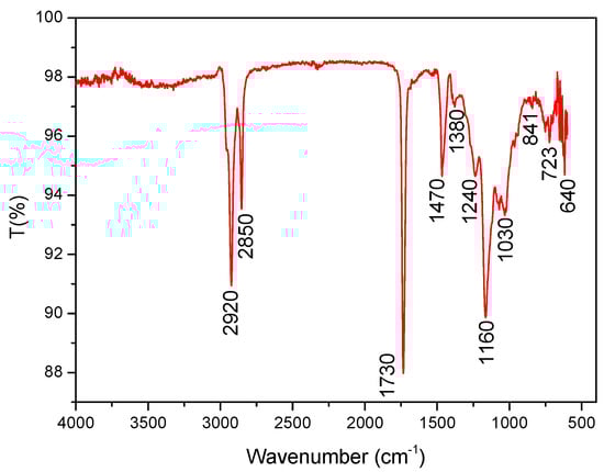 A possible chemical reaction mechanism for OAP is depicted in Figure 4. The FT-IR spectrum of the copolymer prepared by suspension polymerization is shown in Figure 5. The characteristic absorption bands that appeared at 2920 and 2850 cm−1 were assigned to the asymmetric and symmetric stretching vibrations of C–H, respectively. The bands at 1730 cm−1 were attributed to C=O stretching vibration. The bands at 1470 and 1380 cm−1 corresponded to the C–H asymmetric and symmetric bending vibration. The bands at 1240 and 1160 cm−1 were the C–O–C asymmetric stretching vibration and symmetric stretching vibration, respectively. The band at 1030 cm−1 was assigned to the C–N stretching vibration. The bands at 723 and 640 cm−1 were the out of plane bending vibration of N–H (amide V) and C=O (amide VI), respectively. The disappearance of C=C bands usually at 1620–1680 cm−1 indicated the thorough reaction of the monomers.