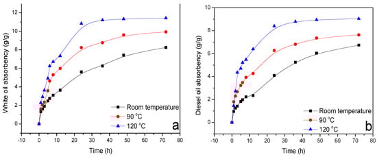 Evolution of oil adsorptive rate with time under various temperatures. Note: (a) white oil; (b) diesel oil.