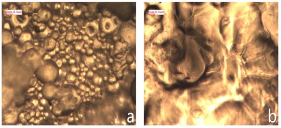 Optical microscope photographs of OAP particles before and after white oil adsorption are displayed in Figure 9. An explicit distinction was observed between original OAP and swollen OAP. As shown in Figure 9a, before oil adsorption, a large amount of spherical particles with some cavities were accumulated together and formed an irregular surface, whereas, after reaching saturated adsorption, the small particles expanded significantly and filled in the gap space between the adjacent particles, forming a smooth surface.
