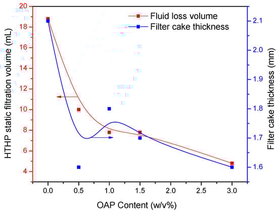 The effect of OAP particles (particle size of 80–100 mesh) on the properties of OBDFs was investigated firstly. OAP with various contents was added into the OBDFs. The fluid was hot-rolled at 120 °C for 16 h. The properties of the fluids before and after hot rolling are given in Table 2. Before hot rolling, the addition of OAP had little influence on the rheological properties of the OBDFs, scuh that AV (calculated with Equation (2)), PV (calculated with Equation (3)), YP (calculated with Equation (4)) and Gel changed slightly with the increase of OAP content; however, after hot rolling, the rheological parameters including AV, PV, YP and Gel strength all increased gradually initially when the OAP content was lower than 1.5 w/v %, and showed a significant increase at content of 3 w/v %. In terms of filtration control, as shown in Table 2, the API fluid loss decreased gradually with the increasing content of OAP for both before and after hot rolling. Also as depicted in Figure 10 and Figure 11, for the HTHP static filtration test conducted under 120 °C and 3.5 MPa after hot rolling, both of the HTHP static fluid loss volume and filter cake thickness decreased with the increased content of OAP, which was reduced by 74% and 24%, respectively, when 3 w/v % OAP was added, indicating that OAP could effectively reduce the filtration loss and improve the filter cake quality. In regard to the electrical stability (ES) of the drilling fluid, which is one of the vital properties of an oil-based drilling fluid, this shows the voltage of the current flowing in the fluid and represents the emulsion stability of the fluid. The emulsion-breaking voltage decreased generally with the increasing content of OAP.