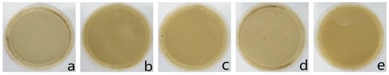 Photograph of HTHP filtration cakes with varying OAP contents. Note: (a) control sample; (b) 0.5 w/v % OAP; (c) 1.0 w/v % OAP; (d) 1.5 w/v % OAP; (e) 3.0 w/v % OAP.