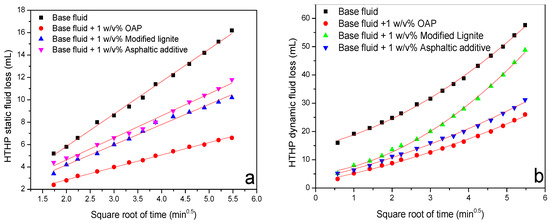 HTHP static fluid loss (a) and dynamic fluid loss (b) versus square root of time.