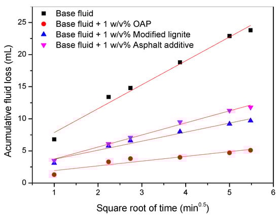 Two commercially available fluid loss additives including asphaltic additive and modified lignite were used as reference to compare the versatility of OAP. The fluid loss additives with 1 w/v % contents were added into the base formula of the OBDF and hot rolled at 120 °C for 16 h, and then the HTHP filtration tests were performed. As shown in Figure 12, for the HTHP static filtration test, the fluid loss volume was 32.4, 13.2, 20.4 and 23.6 mL for the base fluid, fluid containing OAP, modified lignite and asphaltic additives, respectively, showing the capacity of decreasing HTHP static filtration with the sequence of OAP > modified lignite > asphaltic additives. For the HTHP dynamic filtration test, the fluid loss volume increased to 115.2, 52.0, 97.6 and 62.4 mL for the four fluids, showing the ability of decreasing HTHP dynamic filtration following the order of OAP > asphaltic additive > modified lignite. The significant increase of fluid loss compared with that of static filtration lies in the fact that filter cake was more difficult to form under a dynamic shear condition [49]. Overall, the three candidate additives all exhibited effective performance in HTHP filtration control.
