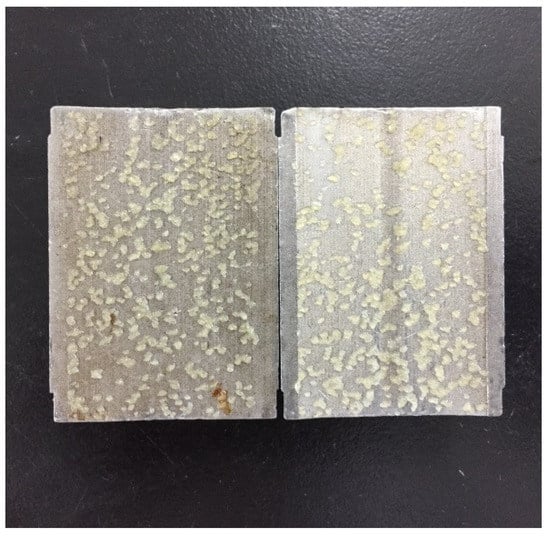 Firstly, the fracture sealing ability of OAP was evaluated by a 0.2 mm width slot to simulate light losses. OBDF with OWR of 80:20 containing 1 w/v % OAP with size of 80–100 mesh was poured into the cell. When the pressure increased to 1.0 MPa, almost all of fluid was lost, indicating sealing failure. After the experiment, the fracture was taken out. As shown in Figure 15, the swollen OAP particles had been forced into the fracture and were distributed along the fracture plane. Unlike rigid materials with high strength, OAP particles exhibited low compressive strength after oil adsorption, which could not form effective sealing alone. However, taking other materials such as SCC particles and sized RUB particles in combination, this relatively narrow fracture was easy to seal.