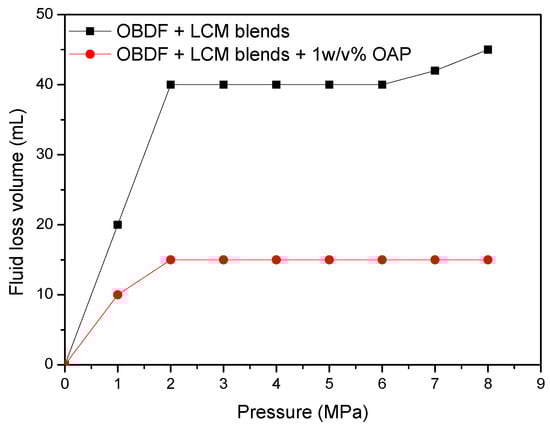 This type of slot was used to simulate moderate to severe losses. To form effective sealing, the SCC particles, rubber particles and fibers with appropriate size distribution and concentration were optimized after extensive experiments, then the optimized formula No. 3 was established as control sample and shown in Table 8. The fracture sealing test results for OBDFs containing formulas No. 3 and No. 4 are given in Figure 18. It was clear that, for both formulas No. 3 and No. 4, a jump of fluid loss was observed at pressure of 2.0 MPa. For formula No. 3, the fluid loss increased to 40 mL at 2.0 MPa and kept almost constant with the further increase of pressure. When the pressure reached 8.0 MPa, the fluid loss was 45 mL. A similar phenomenon was observed for formula No. 4, where the fluid loss increased to 15 mL and kept unchanged regardless of the increase of pressure, again indicating that incorporation of OAP contributed to a denser sealing and lower fluid loss. As shown in Figure 19a, it was seemed that the blended LCMs without OAP were mainly distributed on the tail of the fracture, which was relatively easy to be extruded out of the fracture and led to failure of sealing. While in the presence of OAP, as observed in Figure 19b, the blended LCMs filled along the entire fracture, beneficial to forming a steady sealing. The results also verified that the addition of OAP improved the retention of LCMs in the fractures, which in turn caused lowered fluid loss.