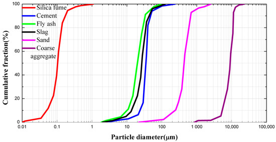 The details of the mixture proportions are summarized in Table 1. Portland cement I 52.5R (Hailuo, Xi’an, China) was used, with a 28-day compressive strength of 58.5 MPa. Supplementary cementitious materials, such as fly ash, silica fume, and ground blast furnace slag were used due to both their technical and economic advantages. In general, smaller aggregate will result in higher compressive strengths, but the use of large aggregate allows for a higher Young’s modulus and a better creep and shrinkage behavior. The maximum diameter of the coarse aggregate was 16 mm. River sand was utilized as the fine aggregate, and the maximum diameter and fineness modulus were 5 mm and 2.83 mm, respectively. The particle size distribution of the materials used is shown in Figure 1. A high water/binder ratio was detrimental to the mechanical properties, deformation, and durability of the concrete. However, a low water/binder ratio was detrimental to the flowability. The water/binder ratio of the HFRC was 0.24. The use of superplasticizers was essential to achieve high strength and good flowability. Two types of fibers with different sizes were added to the test groups, and the specific mechanical properties of fibers are summarized in Figure 2 and Table 2.