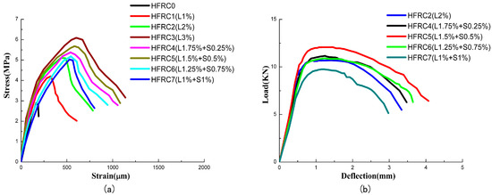 HFRC beams with dimensions of 100 mm × 100 mm × 400 mm were fabricated for the four-point flexural tests, which were carried out in accordance with ASTM C1609-12 [35]. A UTM (CIMACH, Changchun, China) with a maximum load capacity of 300 kN was used, and an axial load was applied with displacement control using at a rate of 0.1 mm/min. Each beam was loaded under four-point flexure to create a pure moment region spanning 100 mm at the center of the beam. The load-deflection curves of different groups are shown in Figure 4. For example, HFRC4 can be used to demonstrate the damage process. Before cracking, the curve of the specimen was approximately linear. After cracking, the loading stiffness decreased, and many flexural cracks appeared in the middle of the HFRC beam. The HFRC beams exhibited a deflection hardening behavior. The short steel fibers bridged the microcracks and improved the cracking distribution by reducing the cracks spacing. The influence of the short fibers decreased as the width of the cracks increased. The long fibers were responsible for the hardening phase. At the ultimate load, the major flexural crack formed. The fibers were pulled out, and squeaking was heard. Finally, the beam failed in flexural failure. The flexural strength is reported in Table 3. The HFRC beams exhibited ductility in the flexural test. The addition of steel fibers into normal concrete mixtures significantly improved the flexural strength of the beams. Compared with HFRC0, the post-cracking strength of HFRC1, HFRC2, and HFRC3 increased by 22.4%, 43.5%, and 116.6%, respectively. It was observed that the flexural strength of HFRC3 was higher than that of HFRC2 and increased by 18.4%. When the volume fraction of short steel fibers was greater than 0.5%, the flexural strength decreased. The post-cracking tensile strength of flexural beams was computed as , where was the effective length of the beams and was the side length of a beam cross-section.