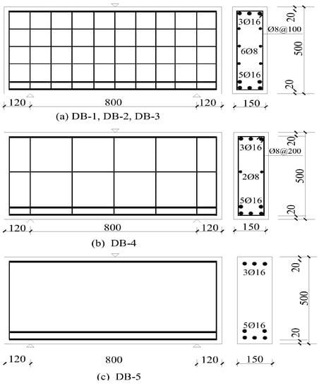 Four HFRC deep beams and one RC deep beam were tested. The test variables included the fiber volume fractions and web reinforcement ratio. Three different levels were considered for the test variables. All of the test specimens had the same rectangular section with a dimension of 150 mm (width) × 500 mm (height) × 1040 mm (length), and the effective span was 800 mm. The shear span to effective depth ratio (a/d) was 0.9. The deep beam reinforcements are exhibited in Figure 6.