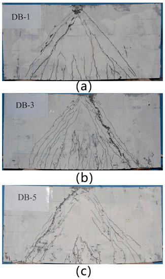 Cracks of specimens. (a) DB-1; (b) DB-2; (c) DB-3.