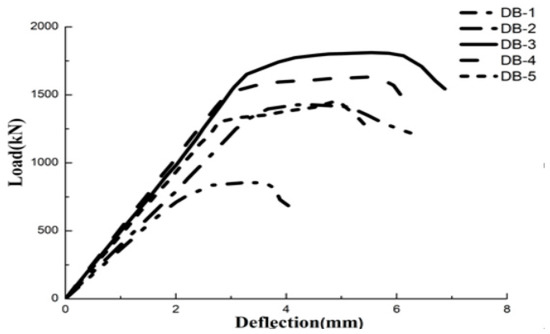 Regarding specimen DB-5, as shown in Figure 8c, when the load reached 369 kN, the first flexural crack occurred in the mid-span. As the load increased to 685 kN, a small crack appeared between the left bearing and loading point. Although this specimen did not have web reinforcement, the load slowly decreased after the ultimate load. In addition, the left shear cracks continued to expand. The test was completed when the load decreased to 85% of the ultimate load. In this case, all of the specimens failed in shear.
