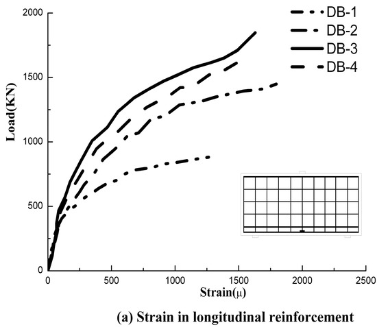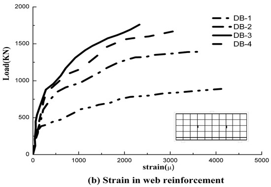 The relationship between load and reinforcement strains is illustrated in Figure 10. The number of strain gauges, which were used in the beams, was decided according to the amount of web reinforcement. All of the strain gauges used in the beams were attached to the web reinforcement in the shear spans. As the first diagonal crack appeared, the concrete strains and web reinforcement developed significantly for DB-1. The presence of the fibers played a major role in the tensile behavior, and the strains of the HFRC deep beams increased slowly. For the deep beams, the largest strains were observed in the web reinforcement across the main diagonal crack that formed between the bearing and loading point. The majority of the web reinforcement reaches the yield strain. However, the strain of the longitudinal reinforcement in the bottom of the beam did not reach the yield strain. In some cases, the position of the strain gauges and major diagonal crack may be biased. Thus, the reinforcement could have yielded even if it was not recorded by the strain gauges.