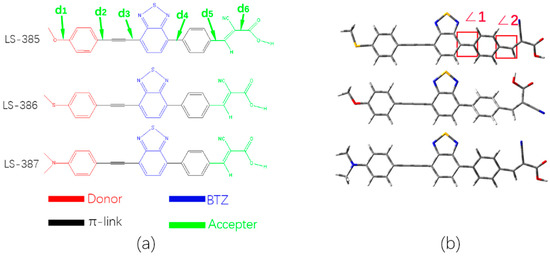The acetylene bridge plays a crucial role in the coplanarity between the benzothiadiazole (BTZ) and the donor group (see Figure 1b). The two dihedral angles ∠1 and ∠2 in vacuum and DMF solvent are listed in Table 1. However, due to the spatial repulsive force between the nitrogen atom and the hydrogen atom of the benzene ring in the BTZ structure, the dihedral angle (∠1) between BTZ and the adjacent phenyl group produces an angle of about 33° (See Table 1). For ∠2, compared with the vacuum, the dihedral angles in solvent are smaller, and LS-387 has the minimal dihedral angle (0.5°) compared with LS-385 and LS-386 in DMF solvent.