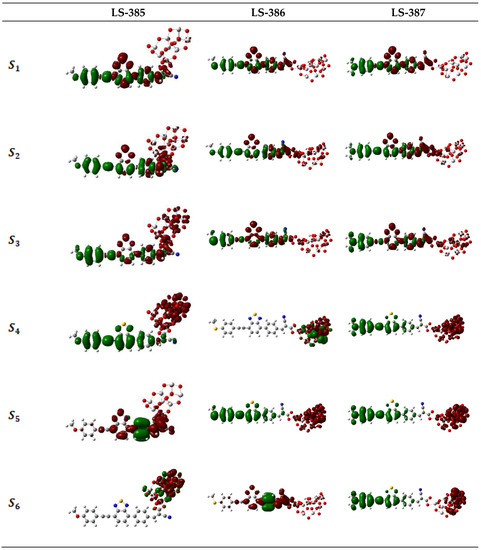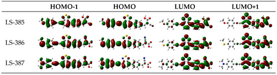 Electronic structure analysis gives the charge transfer characteristics. The energy level of HOMO, LUMO, and energy gaps () and electron density of the frontier MOs are the important parameter reflecting the electronic excitation and transition characteristics of the dyes, shown in Table S1 and Figure 2 and Figure 3. As shown in Figure 2, HOMO and LUMO belong to the π and , respectively [35]. For LS-385 and LS-386, the electron density of HOMO is distributed on the D-π--π part; the electron density of LUMO resides in the π--π- part; and for LUMO+1, the electron density is the distribution on the -π- part; most of the electrons are in the acceptor; and for the HOMO-1, the electron is distributed throughout the molecule. LS-385 and LS-386 exhibit a similar electron density distribution. For LS-387, the LUMO distribution is not significantly different from the other two molecules, but HOMO energies have a good aggregation on the donor, indicating that LS-387 has a better push-pull effect.