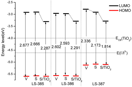 As show in Table 5, the , the , and || of LS-385, LS-386 and LS-387 were calculated. The oxidation potential () of the three dyes in vacuum is as follows: LS-387 (2.364 eV) < LS-386 (2.658 eV) ≈ LS-385 (2.654 eV), and in solvent is as follows: LS-387 (2.449 eV) < LS-386 (2.677 eV) < LS-385 (2.681 eV); so LS-387 has a lower value of in vacuum and solvent. Lower will result in easier photooxidation.