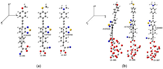 An important indicator for assessing injection capacity is ionization potential (IP) and electron affinity (EA) for holes and electrons, respectively [40,41,42,43]. IP represents the energy change of electron extraction or hole addition. EA means the change in energy of hole extraction or electron absorption [35]. As shown in Table S2, the IP of the three molecules in the order: LS-385(6.67 eV) > LS-386 (6.64 eV) > LS-387 (6.23 eV), and the smallest LS-387 has the better injection capacity. The EA of the three dyes is as follows: LS-387 (1.80 eV) < LS-385 (1.93 eV) < LS-386 (1.99 eV), and the higher the EA, the higher the electronic acceptability becomes [44]; so LS-386 has a greater ability to inject electrons. Nevertheless, the IP of the three dyes in solvent goes down compared with vacuum, and LS-387 in solvent has the lower IP of 4.92 eV, which also indicates that LS-387 is more advantageous for extracting electrons. The is used to characterize the electronic contribution of the dye molecules. As shown in Table S2, the of the three dyes in vacuum is as follows: LS-385 (4.74 eV) > LS-386 (4.65 eV) > LS-387 (4.43 eV), and in solvent the dye of LS-387 has a lower of 1.76 eV, which is in agreement with the experiment [16]. The is vacuum > solvent, therefore, the molecules in the DMF solvent produce a better electronic capability than in vacuum.
