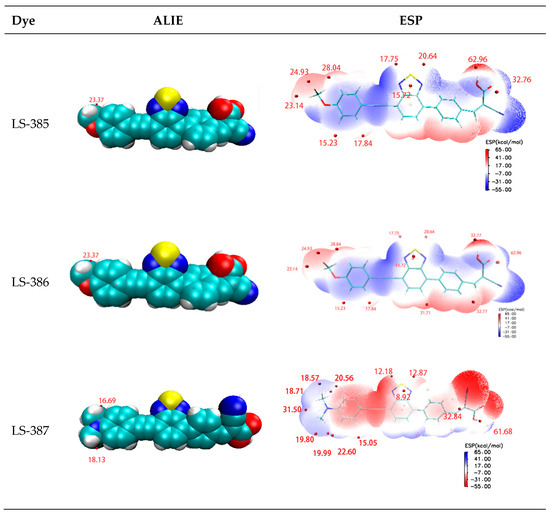 It is very important to gain electrons in the regeneration process of dyes. Molecular surface electrostatic potential (ESP) [59] and average local ionization energy (ALIE) [60] can be used to determine the active sites of electrolyte and dye cations in the active region. A higher ESP site means the site attracts the strongest nucleophilic agent and is most likely to interact with the negatively charged electrolyte [37]. One of the most important roles of ALIE is to predict the reaction sites for electrophilic or free radical attack. The minimum value of surface ALIE can effectively reveal which atoms are more likely to be the preferred location for electrophilic or free radical attack. The relevant data and images are summarized in Figure 7. As shown, the minima of ALIE distributed near the donor atom (O, S, N), and LS-387 has a smaller value than LS-385 and LS-386. Furthermore, in the donor site, the maxima ESP have a concentrated distribution near the N atom site of LS-387. It seems that the main atoms O, S, N of donor complement can serve as active sites for dye molecules and electrolytes. The extreme points of ALIE and ESP determine that the donor site may be a point of interest for electrolyte ions.