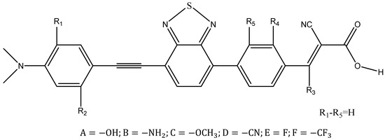 Since the beginning of the 21st century, environmental degradation and energy consumption have intensified. In order to realize the sustainable development of the environment and human society, it has become urgent to explore and develop new energy sources. Currently, silicon-based solar cells play a vital role in the field of energy with their excellent photoelectric conversion efficiency of about 26.6%. However, their disadvantages, such as high cost, non-renewable raw materials, difficulty in preparation and not easy to be improved, have limited their wide application. Since O’Regan and Grätzel in 1991 [1] reported the highly efficient dye-sensitized solar cells (DSSCs) based on Ru complex with photoelectric conversion efficiency (PCE) of 7.1–7.9%, more and more attention has been paid to DSSC due to its comparatively low cost and high efficiency [2,3,4,5]. DSSCs sensitized by free-metal organic dyes have been attracting attention by researchers for their clean and environment-friendly characteristics [6]. Particularly, the structural diversity and the simple synthetic routes of organic dye molecules provide the possibility to seek more competitive DSSC sensitizers [7]. For DSSCs, the core component is the sensitizing agent, which is divided into two kinds: metal-free organic dyes and metallic dyes [8]. Among them, organic dyes have the characteristics of low price, high extinction coefficient, adjustable structure, and light absorption characteristics by molecular design [9,10]. In order to achieve higher PCE, development of new structures, materials, and technologies has become important for researchers to improve conversion efficiency. From the viewpoint of molecular structures, donor-π bridge-acceptor (D-π-A) dyes have been widely used for non-metallic organic dye sensitizers; in addition, researchers have developed various molecular configurations (such as D-A-π-A, D-(π-A)2 and D-π-A4 etc.) to be used as the unit of the sensitizing agent for solar cells [11,12,13].