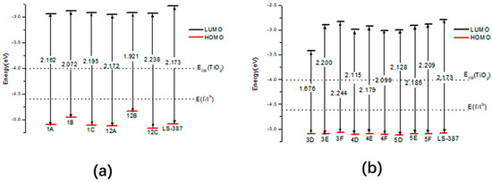 Energy level in solvent of LS-387-based designed molecules, where (a) is LS-387-X (X = 1A, 1B, 1C 12A, 12B and 12C), (b) is LS-387-Y (Y = 3D, 3E, 3F, 4D, 4E, 4F, 5D, 5E and 5F).