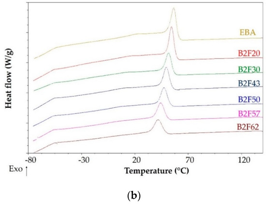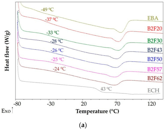 DSC experiments were also carried out to evaluate the miscibility between the EBA copolymer and the ECH resin in the blends. Figure 4a shows the DSC thermograms of the EBA copolymer, the ECH resin and their binary blends. The glass transition (Tg) and melting (Tm) temperatures of the EBA copolymer + ECH resin blends were evaluated from the second DSC heating run, and the glass transition can be observed as an inflexion; the melting temperature is taken as the minimum of the endothermic peak. The Tg value of the EBA copolymer is −49 °C and the one of the ECH resin is 43 °C. The presence of multiple glass transition temperatures can be used as a criterion of incompatibility in binary blends. However, because the Tg value of the polyethylene domain in EBA is the only one observed in the DSC thermograms of the binary blends, their compatibility from the Tg values of the blends cannot be assessed properly. However, an increase in the Tg value of the polyethylene domain in EBA copolymer by increasing the amount of ECH resin up to 50 wt% is observed, suggesting an increase of the compatibility; nevertheless, the binary blends containing more than 50 wt% ECH resin show similar compatibility (Figure 4a). These results agree well with the ones obtained by measuring the softening points of the binary blends.