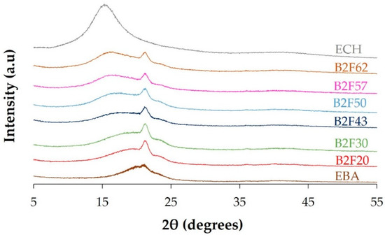 The crystallinity of EBA copolymer + ECH resin blends was also determined by X-ray diffraction experiments. The X-ray diffractograms of the EBA copolymer, the ECH resin, and their binary blends are shown in Figure 5. The X-ray diffractogram of the EBA copolymer shows a broad peak between 15 and 25 degrees and a slight diffraction peak at 2Θ = 21.4 degrees (associated to the orthorhombic phase of the polyethylene domains in the EBA copolymer [22]). On the other hand, the X-ray diffractogram of the ECH resin shows a broad peak between 10 and 20 degrees, indicating that it is amorphous. The addition of the ECH resin broadens the amorphous diffraction peak (due to the poly(n-butyl acrylate) domains) of the EBA copolymer in the blends and the narrow diffraction peak of the polyethylene domains at 2Θ = 21.4 degrees is more clearly distinguished, pointing to higher degree of separation between the amorphous and crystalline domains in the blends. Due to higher degree of phase separation between the polyethylene and poly(n-butyl acrylate) domains of the EBA copolymer, the diffraction peak of the polyethylene domain is better distinguished in the blends than in the copolymer. The intensity of the diffraction peak of the crystalline part of the binary blends at 2Θ = 21.4 degrees decreases when increasing the amount of ECH resin up to 50 wt% (Figure 6a), this indicates a decrease of the crystallinity, and the intensity does not vary in the blends containing more than 50 wt% (100 phr) ECH resin; these trends agree well with the evidences provided by the DSC experiments. On the other hand, the maximum of the broad diffraction peak of the amorphous part of the binary blends decreases from 2Θ = 18.8 degrees in B2F20 blend to 2Θ = 16.6 degrees in the B2F62 blend, likely due to the miscibility between the polar ester moieties of the ECH resin and the polar acrylate groups of the EBA copolymer. In fact, Figure 6b shows a decrease in 2Θ value of the peak of the amorphous part of the binary blends by increasing their ECH resin content up to 50 wt%, the 2Θ value does not vary in the binary blends containing 50 wt% or more ECH resin.