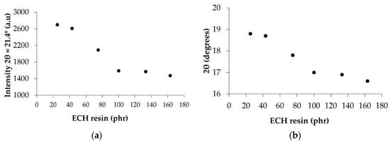 (a) Variation of the intensity of the diffraction peak at 2θ = 21.4 degrees of the EBA copolymer + ECH resin blends as a function of their ECH resin content. X-ray diffraction experiments. (b) Variation of the 2θ value of the amorphous part of the EBA copolymer + ECH resin blends as a function of their ECH resin content. X-ray diffraction experiments.
